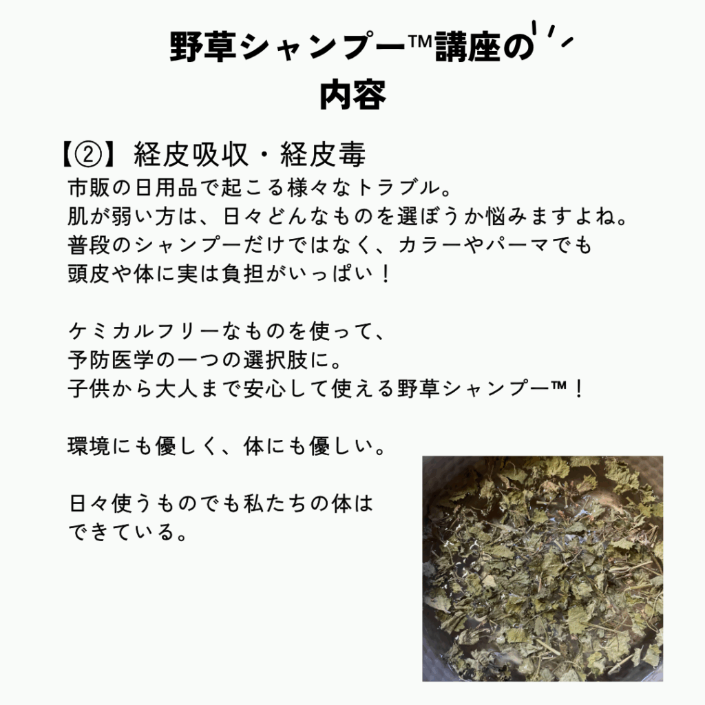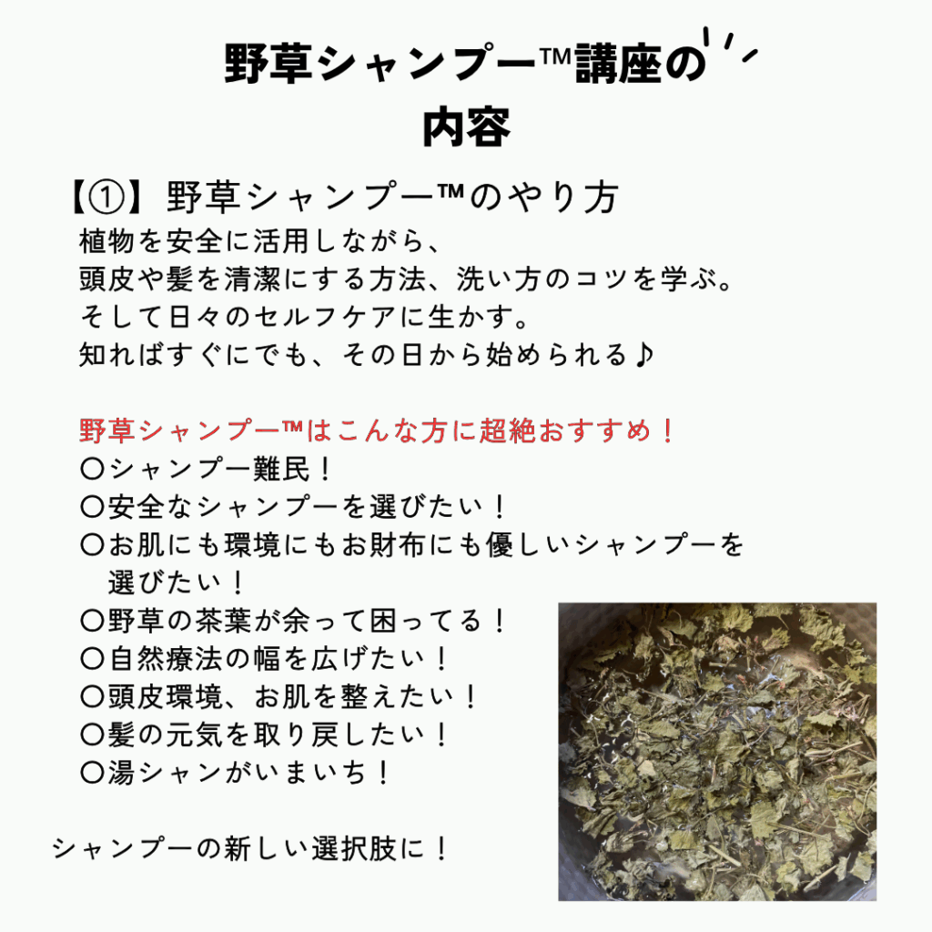 やり方に加え、野草シャンプー™のメリットや大事な注意点、野草シャンプー™を継続することで起こる嬉しい事など、